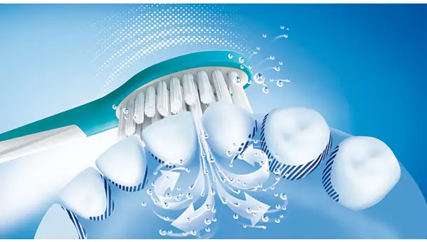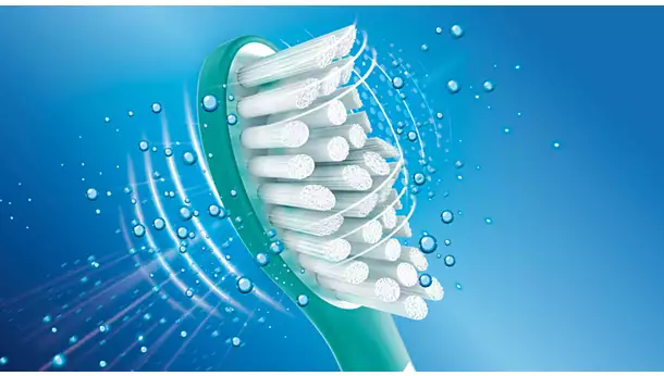 Napredna sonična tehnologija Philips Sonicare omogoča izjemno dnevno čiščenje tako, da brizga vodo med zobe ter s ščetkami drgne in odstranjuje razpadle obloge.
