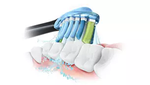 Močne sonične vibracije premikajo ščetine s frekvenco kar 62.000-krat na minuto in spravijo mehurčke, ki odstranjujejo zobne obloge, med zobe in ob robovih dlesni ter tako odstranijo do 10-krat več zobnih oblog kot ročna zobna ščetka.
